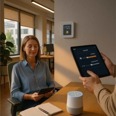 Tecnologías de inmótica que se integran con sensores e inteligencia artificial para crear espacios inteligentes enfocados en la salud, la accesibilidad y el bienestar de las personas.